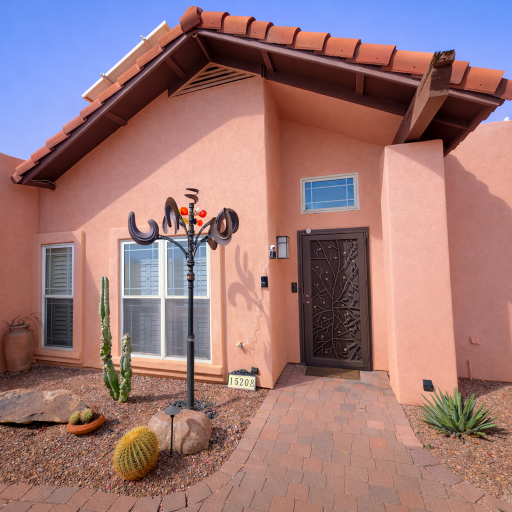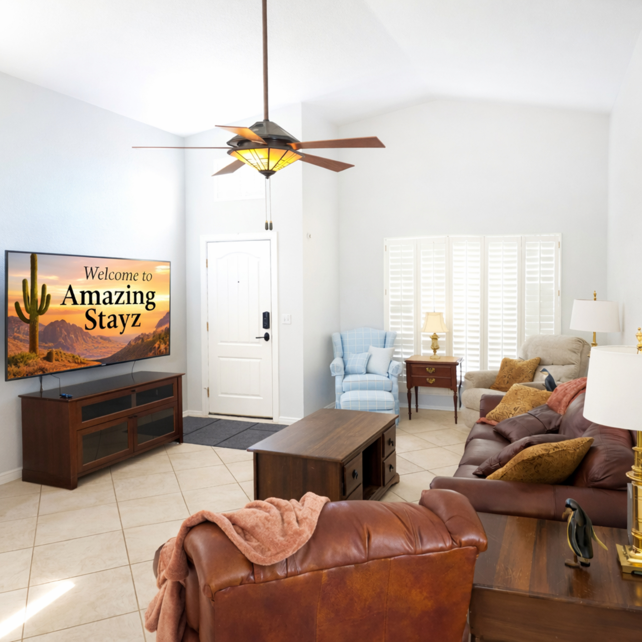 Experience the soul of Scottsdale in this adobe-style retreat with custom art and authentic details. A bright great room with high ceilings and plush electric recliners, designed for relaxation and connection. 75-inch TVs. Four private bedrooms (3 Kings, 1 Queen) share no walls; two are master suites with baths. Outside, a secluded landscaped oasis awaits: lounge by the sparkling private pool in zero-gravity chairs, soak in the hot tub, and dine on the shaded patio with a full-size gas grill.
