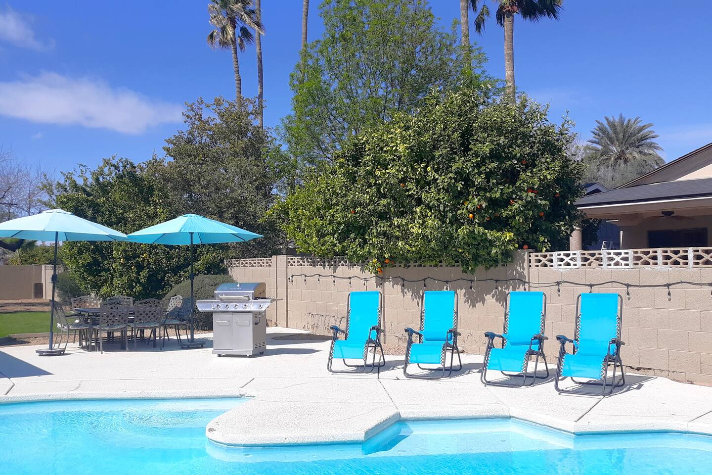 The perfect vacation rental that offers comfort and convenience: * High capacity washer and dryer * Range/stove, dishwasher * Relaxing rain shower heads * Recessed lighting in the living and dining rooms, with dimmer switches to set the perfect ambiance. * Well-equipped kitchen comes complete with a microwave, coffee/tea maker (drip coffee maker and a Keurig), 9-in-1 toaster oven, air fryer etc, ninja blender, range with oven. * Fresh lemons on our trees. Notes: The pool is a diving pool and can be heated for year-round enjoyment. Not everyone swims so * Pool heating does cost extra. Our home is all on one floor, so you don't have to worry about stairs. It offers plenty of space for up to 14 guests (max 6 adults and their children per Scottsdale regulations), with a king bed in the 1st bedroom, a queen bed in the 2nd bedroom, and two Twin XL (extra long) beds in the 3rd bedroom that can be connected to make a king bed. The living room features five full size sofa beds, and two queen air mattresses that are stowed when not needed. We also have a travel crib for little ones complete with blankets and sheets, as well as a high chair. Come stay at our beautiful Scottsdale home and experience the ultimate vacation rental that offers everything you need for a comfortable, luxurious stay.